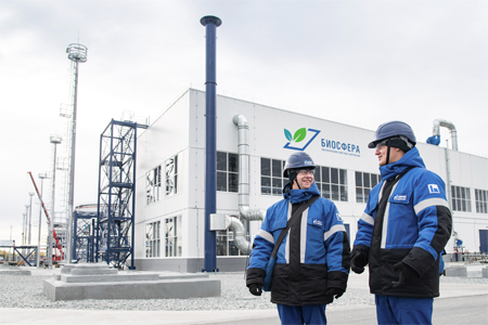 Двенадцать резервуаров объемом от 100 до 20 тысяч кубометров предназначены для предварительной водоподготовки. Они спроектированы и изготовлены российскими производителями в соответствии с международными стандартами экологической безопасности. Сам уникальный комплекс «Биосфера» — это многоступенчатая автоматизированная система, объединяющая несколько этапов очистки. Все промышленные и ливневые стоки собирают в резервуарном блоке после чего направляют на механическую очистку, где удаляют примеси и нефтепродукты. На следующем этапе — физико-химическом — вода очищается реагентами. В центральной части комплекса — биореакторе — воду смешивают со специальным илом, который содержит микроорганизмы, поглощающие остатки нефтепродуктов. В финальной части воду пропускают сквозь угольные фильтры и обеззараживают ультрафиолетом. Полностью очищенная вода возвращается в производство, а отфильтрованные нефтепродукты в переработку.