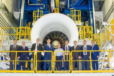 Делегация осмотрела выставку деталей и узлов, созданных в рамках освоения критических технологий двигателя ПД-35, двигатели ПД-14 и ПС-90А на стапелях в зале подготовки к испытаниям, различное технологическое оборудование.